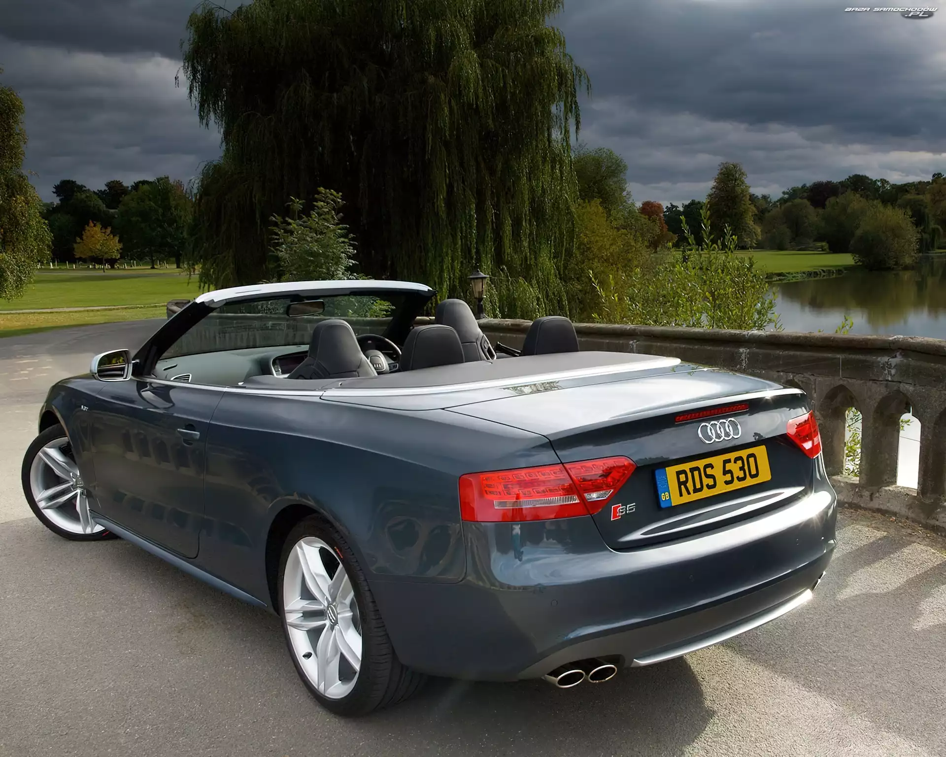 Ciemne, Audi A5, Zieleń, Woda, Cabrio, Niebo- Zdjęcia samochodów